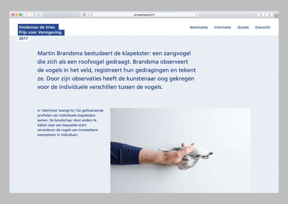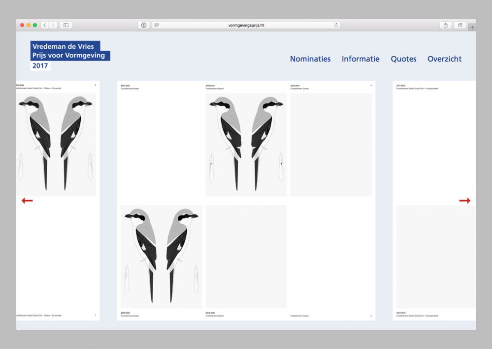 Vredeman de Vries Prijs voor Vormgeving is the design prize of the province of Fryslân. I was asked to design and develop an online exhibition that showcases the nominees and enables visitors to vote for the public choice award. I also designed the presentation shown during the award ceremony. For 2017, we added an overview of all nominees and winners through the years.