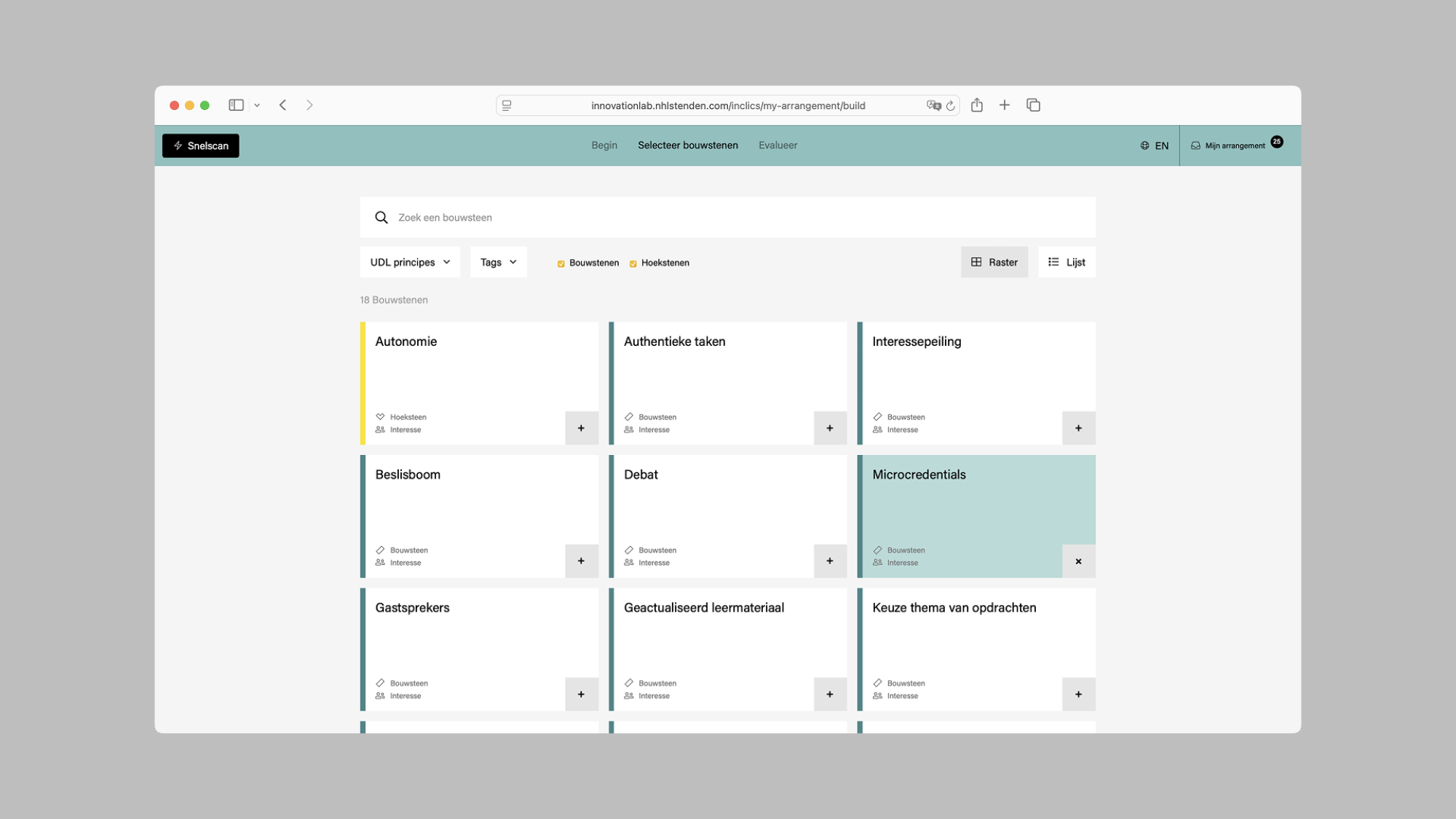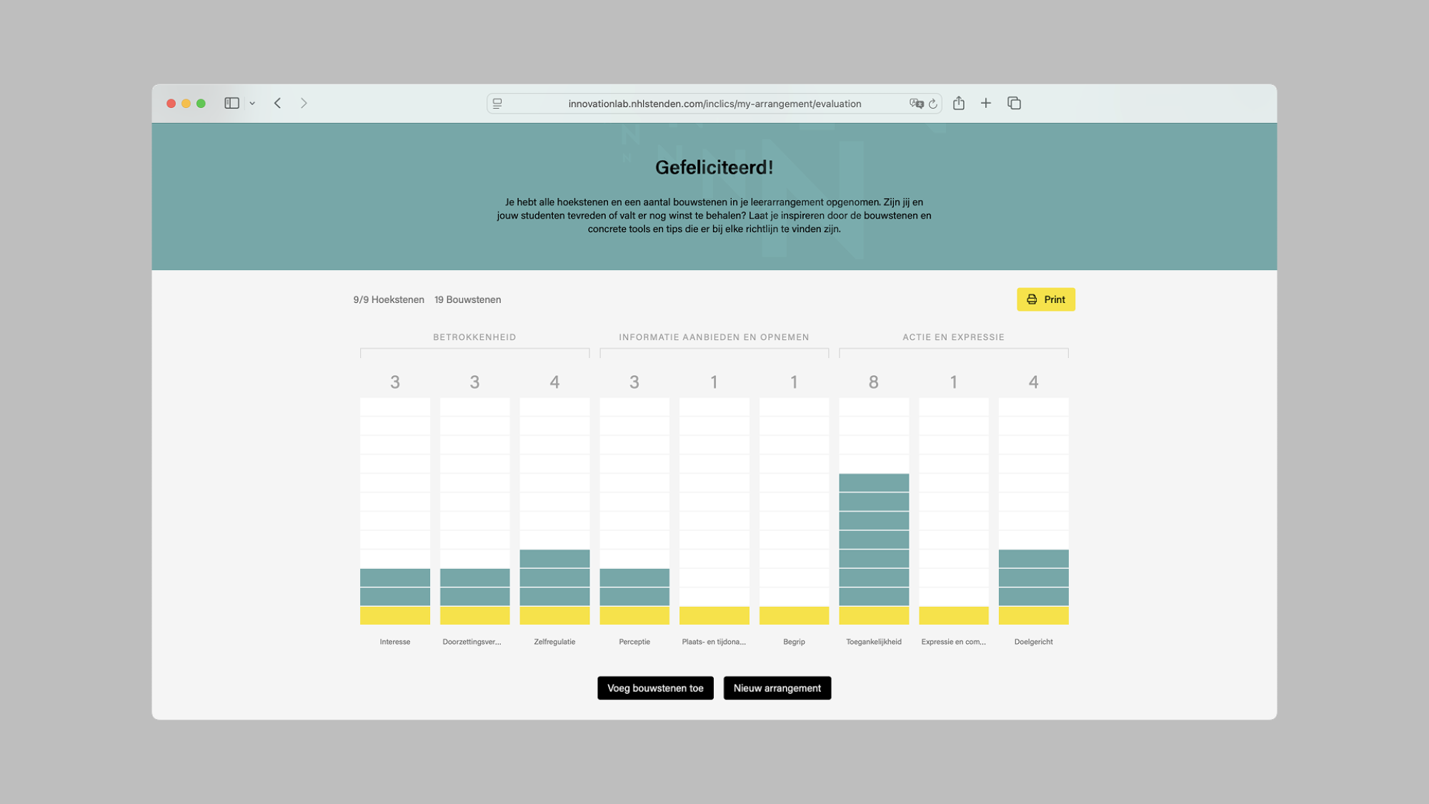 Met de digitale tool kies je bouwstenen die voor jou van toepassing kunnen zijn en 'klik' je zo je arrangement in elkaar. Vervolgens krijg je een helder overzicht met gerichte feedback.